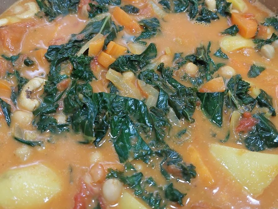 Aujourd’hui je vous partage une recette de curry vĂ©gĂ©tarien qui peut se manger tel quel, Ă©tant dĂ©jĂ un plat complet avec des lĂ©gumes, des fĂ©culents et des protĂ©ines vĂ©gĂ©tales, ou agrĂ©mentĂ© de riz et/ou de protĂ©ines supplĂ©mentaires (tofu, seitan, poulet, cabillaud…) si vous le souhaitez.