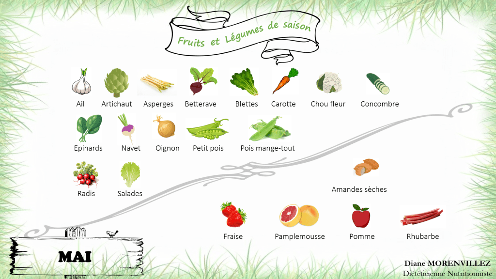 Nous voilà déjà en mai, alors voici les fruits et légumes qu’on peut trouver en ce moment. On va pouvoir se faire plaisir avec des pois frais et se régaler avec de bonnes fraises, miam !
