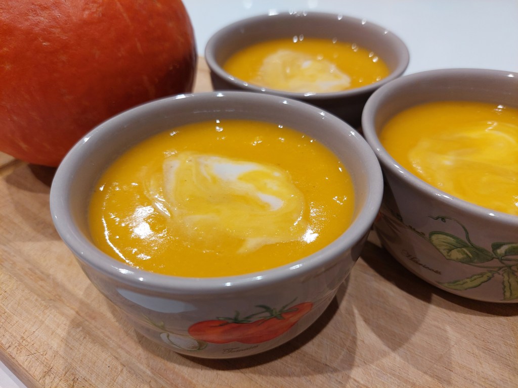 Il s’agit d’une soupe de courge que nous allons Ă©paissir avec quelques lentilles corail, qui apportent Ă©galement un peu de fĂ©culent et de protĂ©ines. Elle peut ĂȘtre consommĂ©e telle quelle en entrĂ©e, mais si vous voulez en faire un repas complet, il faudra la complĂ©ter avec d’autres fĂ©culents et protĂ©ines, car il n’y a pas assez de lentilles dans cette recette pour combler vos besoins. Cela peut ĂȘtre par exemple des Ćufs Ă la coque (protĂ©ines) avec des mouillettes de pain beurrĂ© (fĂ©culents), ou des croque-monsieurs, de la quiche…
